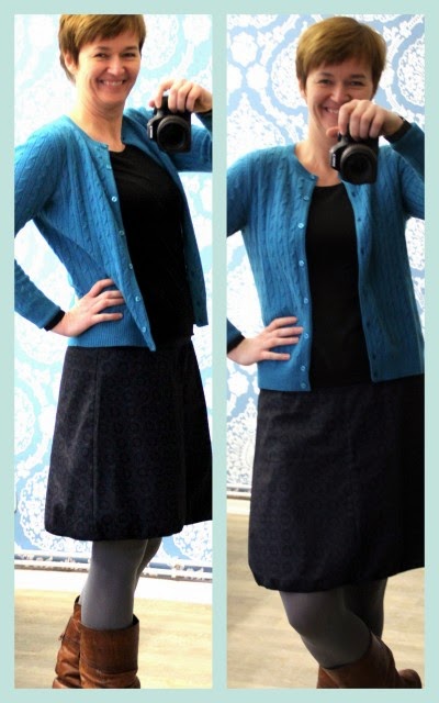 Ich hatte eines meiner Lieblingskleider an. Und die müssen bei häufigem Tragen häufig gewaschen werden. Auch ein Hilco-Stoff hält das nicht ewig durch, irgendwann sieht er selbst bei schonenster Wäsche schrubbelig aus. So auch an jenem Tag. Und dann lag nichts näher, als diesen Schnitt doch einfach noch einmal zu nähen..natürlich nicht die 1:1 Kopie, natürlich nicht! Es sollte ein dunkelblaues Kleid werden, mit petrolfarbenen Paspeln (ich liebe diese Kombi) und roten Kontrastnähten.